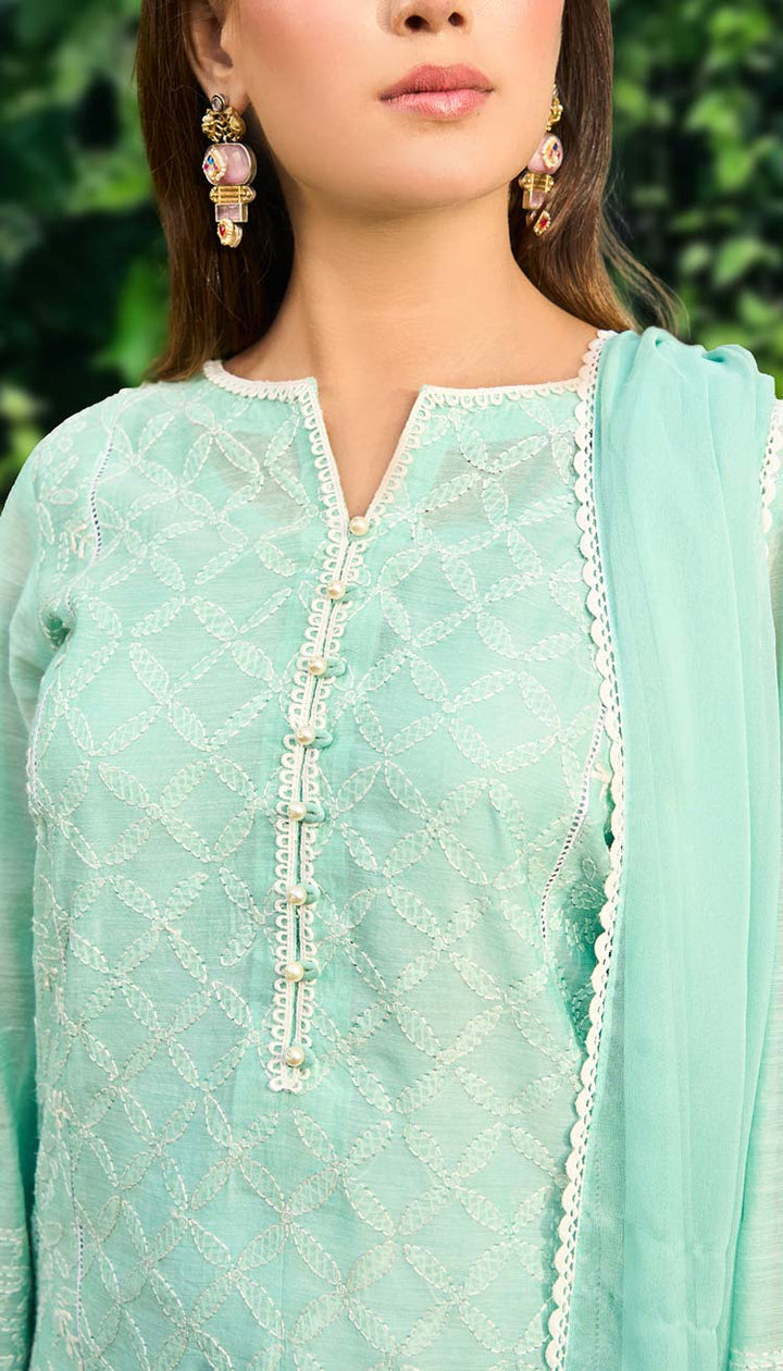 “Sundar” is made of a unique chikankari hand-embroidery technique. The tiny motifs span from floral designs to geometric shapes, with each stitch carefully placed to produce a magnificent visual effect. The lightweight fabric allows you to enjoy your summer events freely.