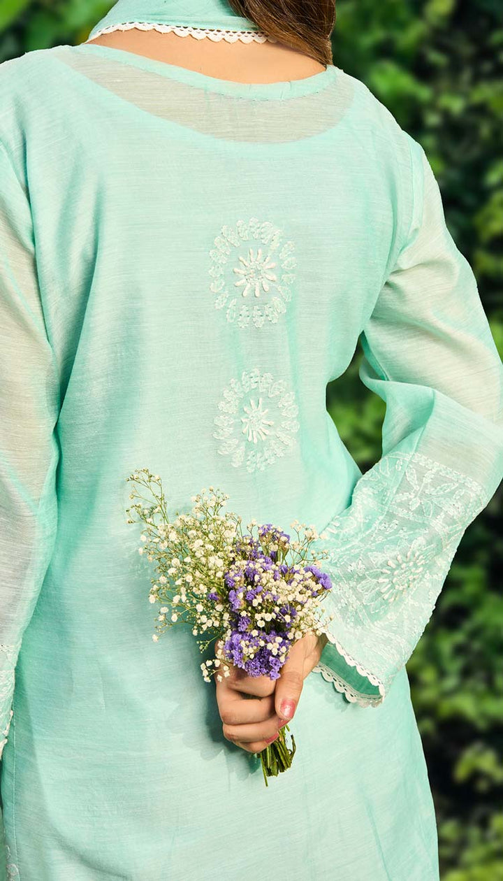 Please note that the Indian chikankari design may differ from the image due to its unique handcrafted nature, where each design is one-of-a-kind and can't be mass-produced. Hence showcasing the beauty of this old-age Indian craft. However, the outfit's stitching details and color will match the image.