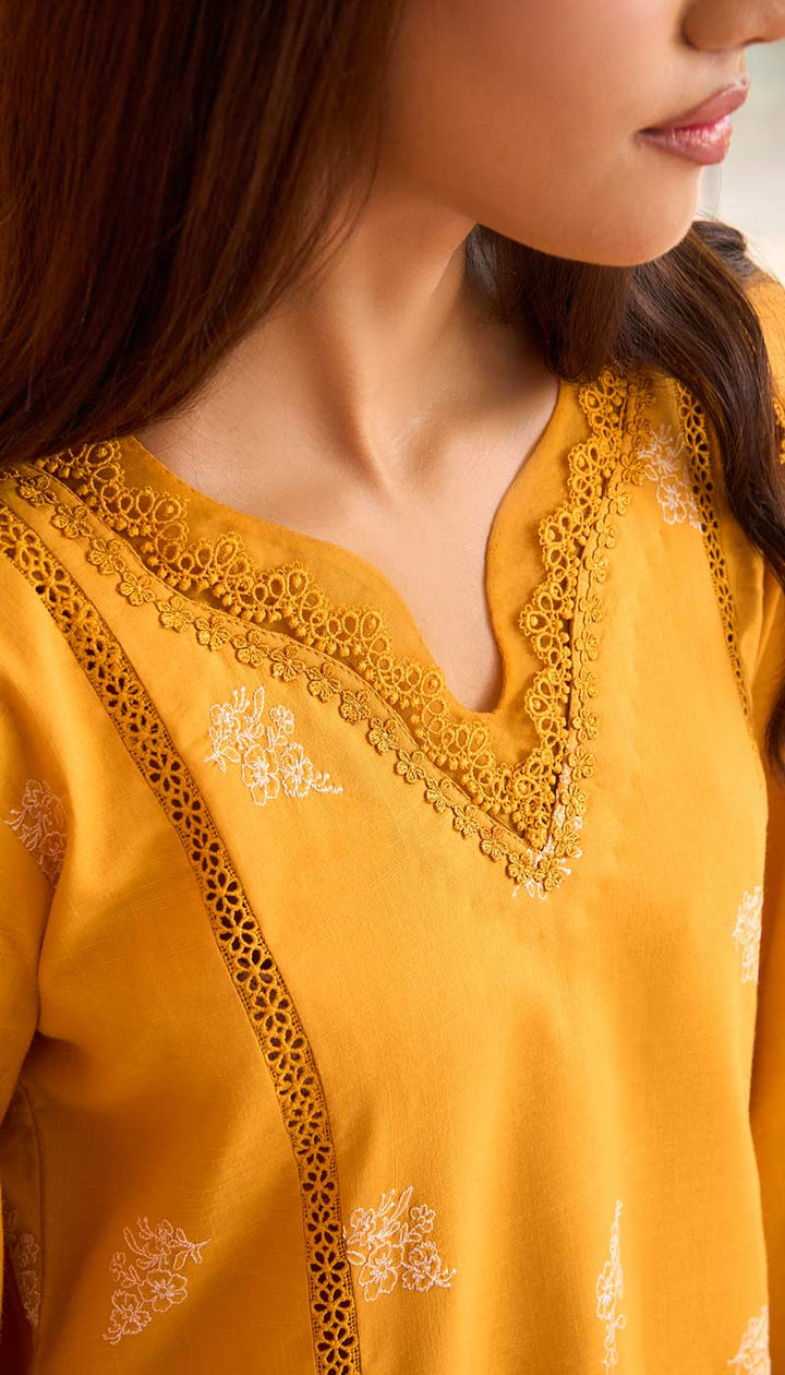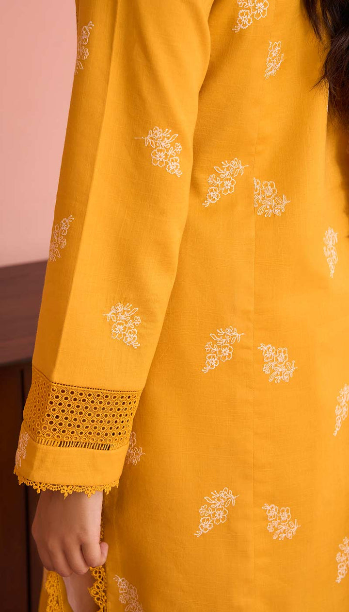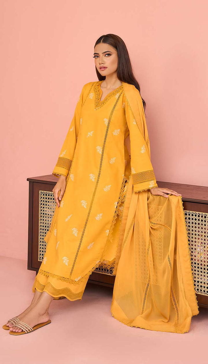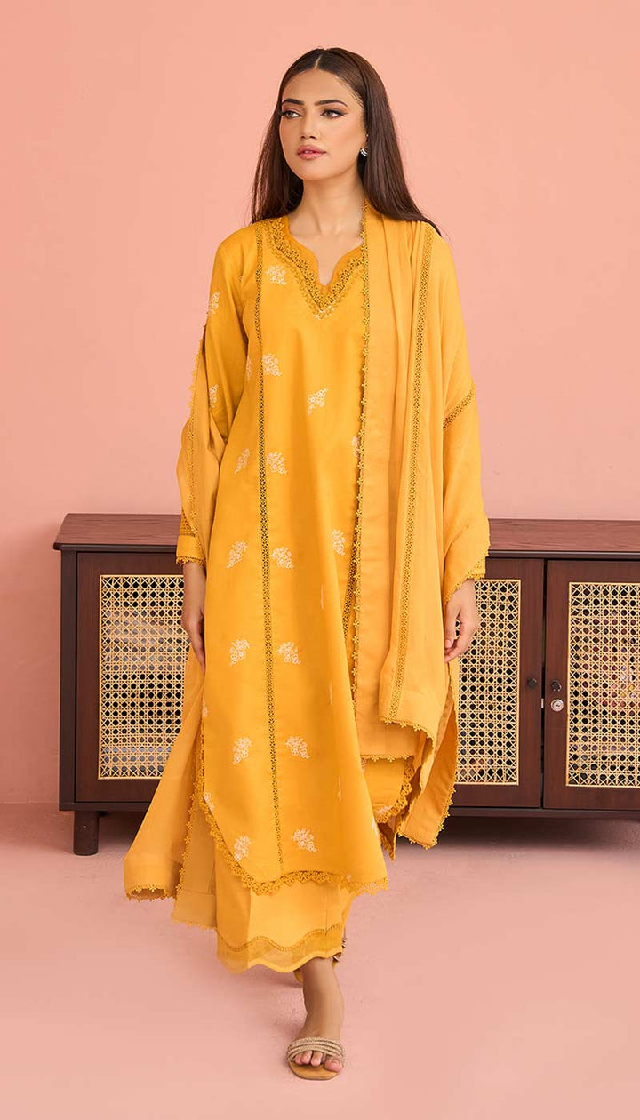 Discover the elegance of our thread lawn suits, a blend of craftsmanship and elegance. The shirt has delicate embroidery, and the neckline is embellished with laces. Dupatta and trousers are adorned with the finest quality lace.