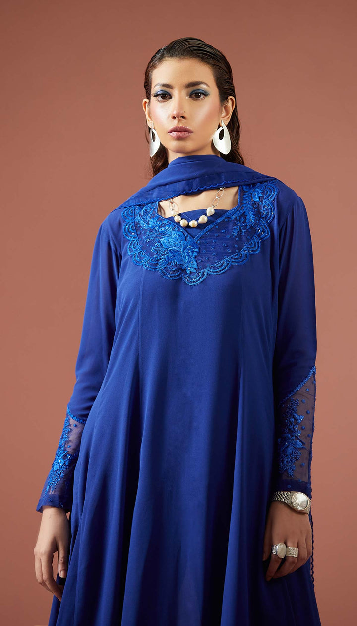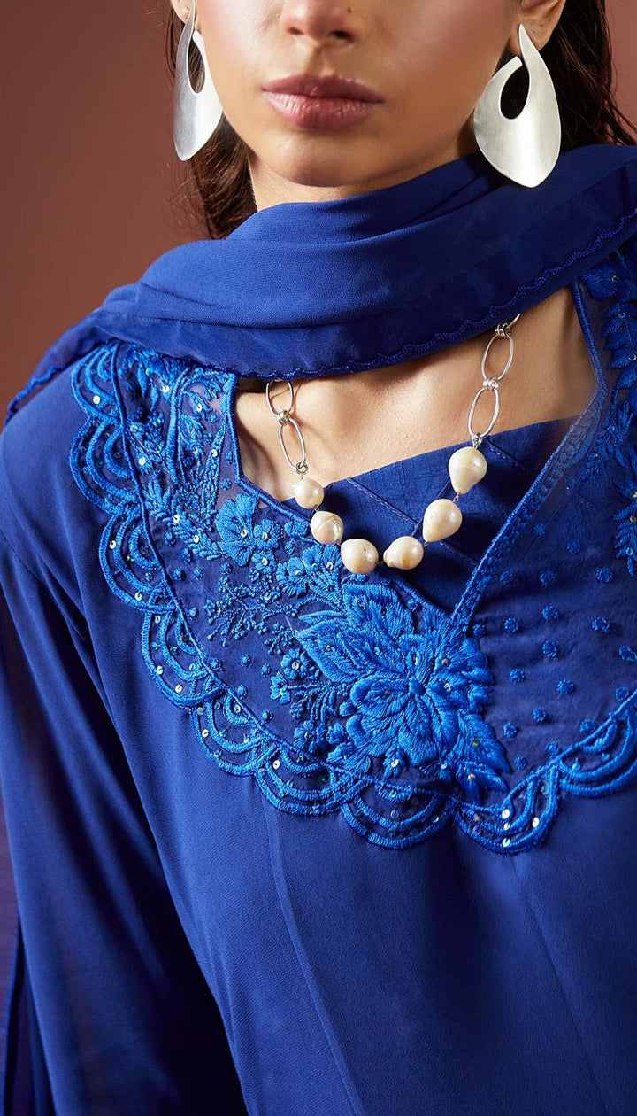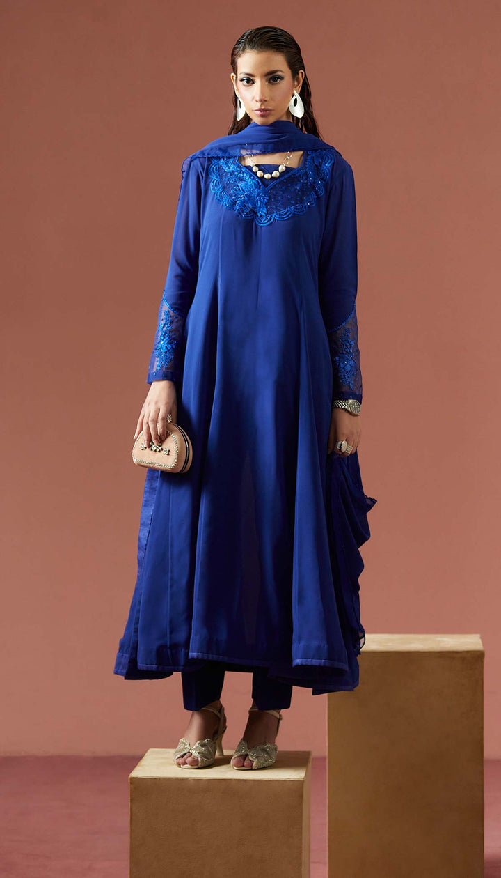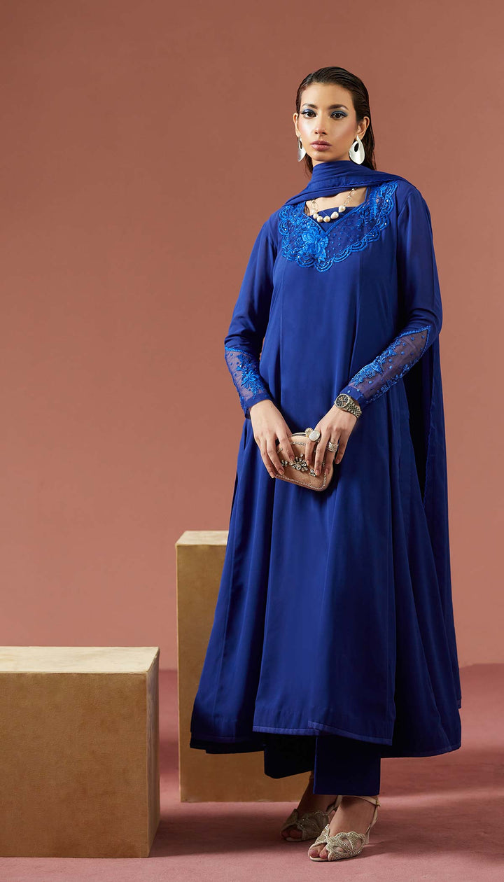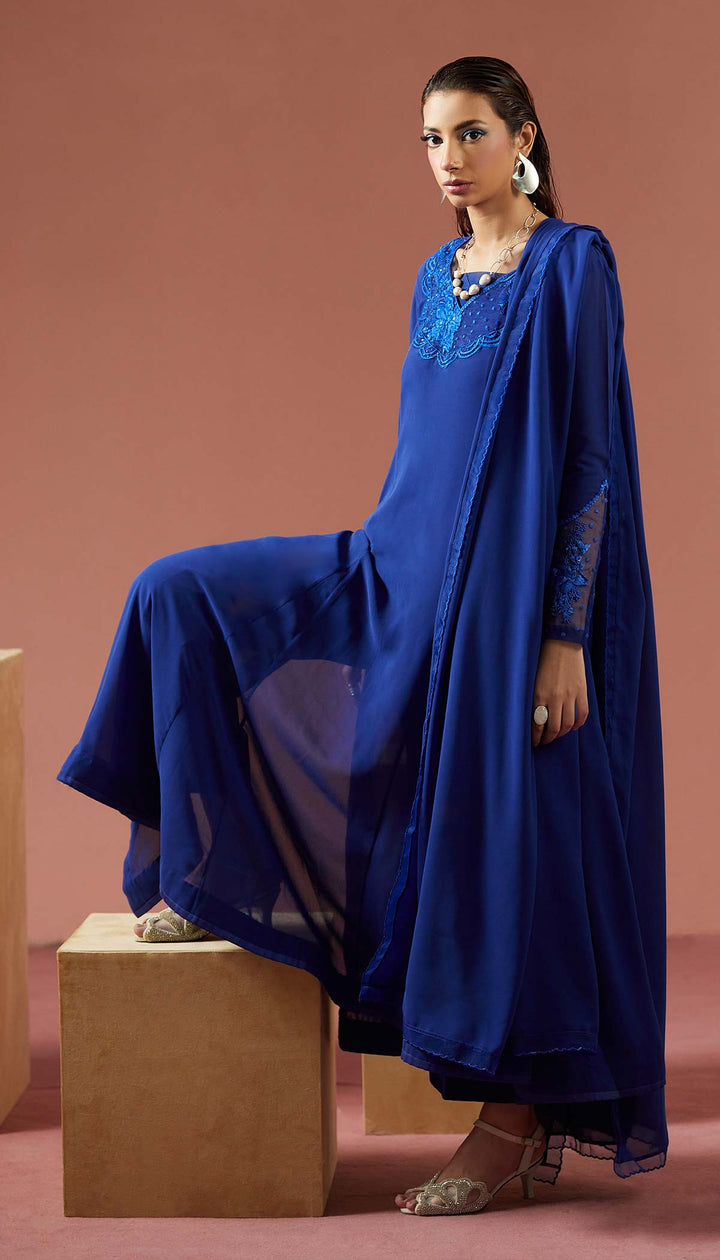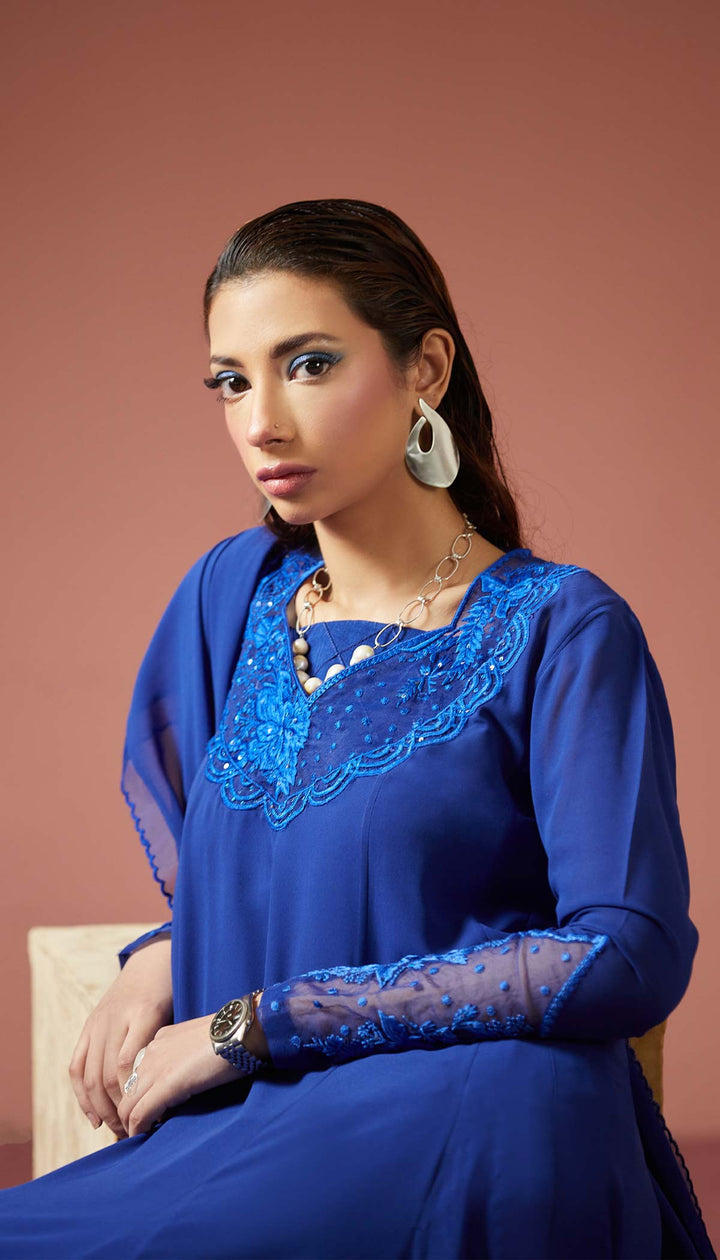 A unique georgette,a-line flared shirt paired with an ajjar and a scalloped dupatta. It is already a piece of art, seeing the sheer neckline and sleeves with shadow embroideries edged with sequins make it a minimal yet impactful fit in our collection!