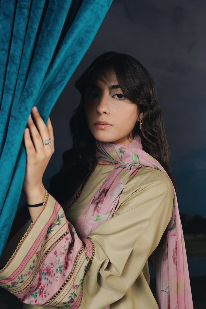 With its muted green canvas and detailed sleeves, Vesper is timeless sophistication personified. The wide cuffs and intricate printed borders give it a contemporary yet classic feel. A subtle beauty for women who love understated charm.