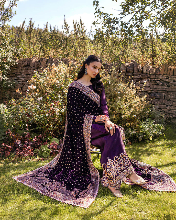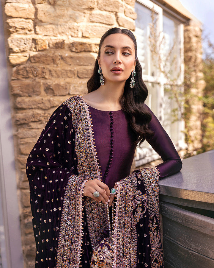 Harnessing high glam, Vespera radiates elegance in an eye-catching deep plum hue. Crafted on an opulent silk, the pants feature lavishly crafted resham and sequin motifs. This set is paired with a silk shirt and an exquisitely embroidered velvet shawl, elevating the look to sartorial perfection, ensuring you turn heads wherever you go.