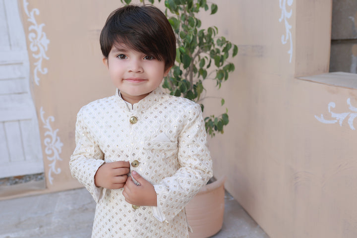 This white prince coat in raw silk with sequin embroidery is absolutely stunning. The combination of white color and the shimmering sequin embroidery creates a truly mesmerizing effect. The raw silk fabric adds a luxurious touch, giving the coat a regal and elegant look. It’s the perfect choice for a wedding or formal event where you want to stand out.