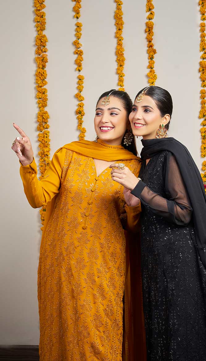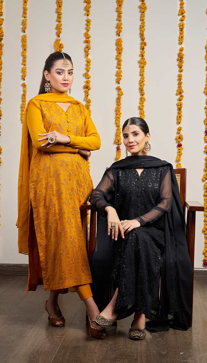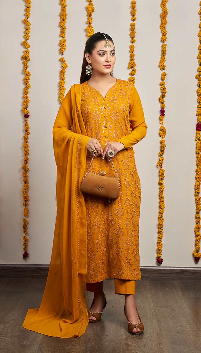 This eye-catching mustard chiffon dress “Zarnaab” is a striking outfit that blends heritage and modern design. It is made by the deep mustard hue and flowing chiffon. It is ideal for festive season.