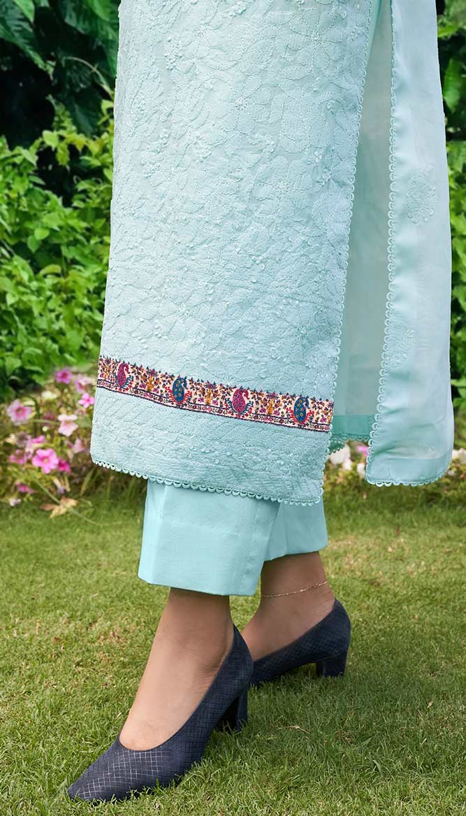 This ethereal chikankari outfit is enhanced by striking qalamkari borders on the sleeves and shirt, showcasing the beauty of two time-honored crafts. The chikankari embroidery, known for its intricate and delicate threadwork, adds a serene elegance to the ice blue fabric. Complementing it, the qalamkari borders feature hand-painted motifs, crafted with precision using natural dyes.